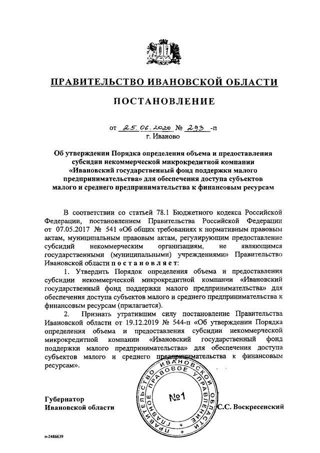 Постановление Правительства Ивановской области от 25.06.2020 N 293-п "Об утверждении Порядка определения объема и предоставления субсидии некоммерческой микрокредитной компании "Ивановский государственный фонд поддержки малого предпринимательства" для обеспечения доступа субъектов малого и среднего предпринимательства к финансовым ресурсам"