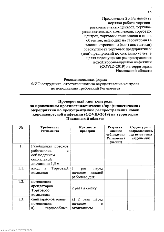 Постановление Правительства Ивановской области от 01.07.2020 N 298-п "О внесении изменений в постановление Правительства Ивановской области от 08.05.2020 N 209-п "Об утверждении регламентов по проведению профилактических мероприятий и дезинфекции в целях недопущения распространения новой коронавирусной инфекции (COVID-2019) на территории Ивановской области" (вместе с "Регламентом порядка работы торгово-развлекательных центров, торгово-развлекательных комплексов, торговых центров, торговых комплексов и иных объектов, имеющих на территории (в здании, строении и (или) помещении) совокупность торговых предприятий и (или) предприятий по оказанию услуг, в целях недопущения распространения новой коронавирусной инфекции (COVID-2019) на территории Ивановской области")