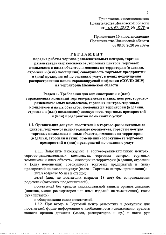 Постановление Правительства Ивановской области от 01.07.2020 N 298-п "О внесении изменений в постановление Правительства Ивановской области от 08.05.2020 N 209-п "Об утверждении регламентов по проведению профилактических мероприятий и дезинфекции в целях недопущения распространения новой коронавирусной инфекции (COVID-2019) на территории Ивановской области" (вместе с "Регламентом порядка работы торгово-развлекательных центров, торгово-развлекательных комплексов, торговых центров, торговых комплексов и иных объектов, имеющих на территории (в здании, строении и (или) помещении) совокупность торговых предприятий и (или) предприятий по оказанию услуг, в целях недопущения распространения новой коронавирусной инфекции (COVID-2019) на территории Ивановской области")