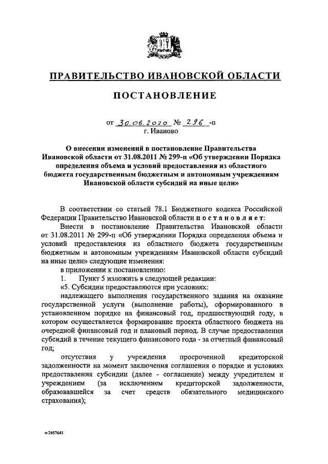 Постановление Правительства Ивановской области от 30.06.2020 N 296-п "О внесении изменений в постановление Правительства Ивановской области от 31.08.2011 N 299-п "Об утверждении Порядка определения объема и условий предоставления из областного бюджета государственным бюджетным и автономным учреждениям Ивановской области субсидий на иные цели"