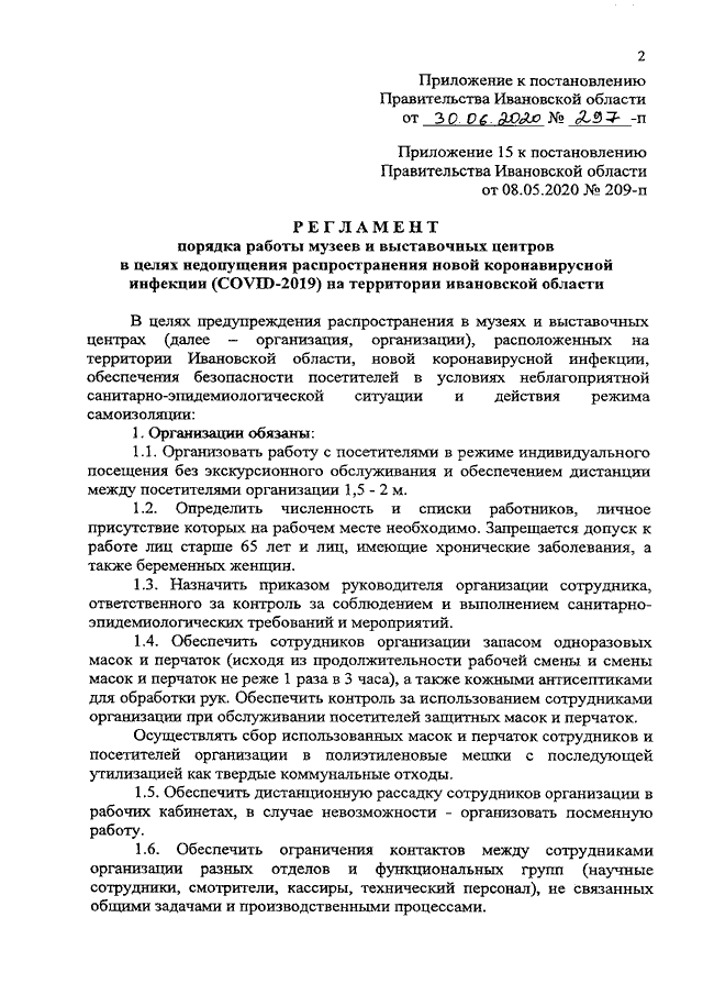 Постановление Правительства Ивановской области от 30.06.2020 N 297-п "О внесении изменений в постановление Правительства Ивановской области от 08.05.2020 N 209-п "Об утверждении регламентов по проведению профилактических мероприятий и дезинфекции в целях недопущения распространения новой коронавирусной инфекции (COVID-2019) на территории Ивановской области" (вместе с "Регламентом порядка работы музеев и выставочных центров в целях недопущения распространения новой коронавирусной инфекции (COVID-2019) на территории Ивановской области")