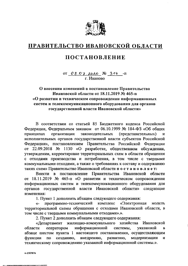 Постановление Правительства Ивановской области от 08.07.2020 N 314-п "О внесении изменений в постановление Правительства Ивановской области от 18.11.2019 N 465-п "О развитии и техническом сопровождении информационных систем и телекоммуникационного оборудования для органов государственной власти Ивановской области"