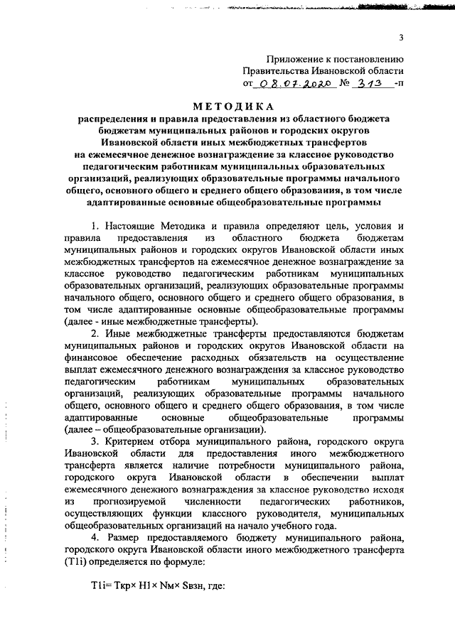 Постановление Правительства Ивановской области от 08.07.2020 N 313-п "Об обеспечении выплат ежемесячного денежного вознаграждения за классное руководство педагогическим работникам государственных образовательных организаций Ивановской области и муниципальных образовательных организаций, реализующих образовательные программы начального общего, основного общего и среднего общего образования, в том числе адаптированные основные общеобразовательные программы" (вместе с "Методикой распределения и правилами предоставления из областного бюджета бюджетам муниципальных районов и городских округов Ивановской области иных межбюджетных трансфертов на ежемесячное денежное вознаграждение за классное руководство педагогическим работникам муниципальных образовательных организаций, реализующих образовательные программы начального общего, основного общего и среднего общего образования, в том числе адаптированные основные общеобразовательные программы")