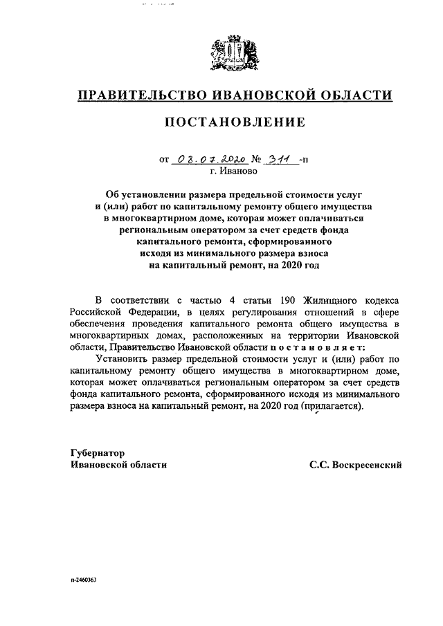 Постановление Правительства Ивановской области от 08.07.2020 N 311-п "Об установлении размера предельной стоимости услуг и (или) работ по капитальному ремонту общего имущества в многоквартирном доме, которая может оплачиваться региональным оператором за счет средств фонда капитального ремонта, сформированного исходя из минимального размера взноса на капитальный ремонт, на 2020 год"