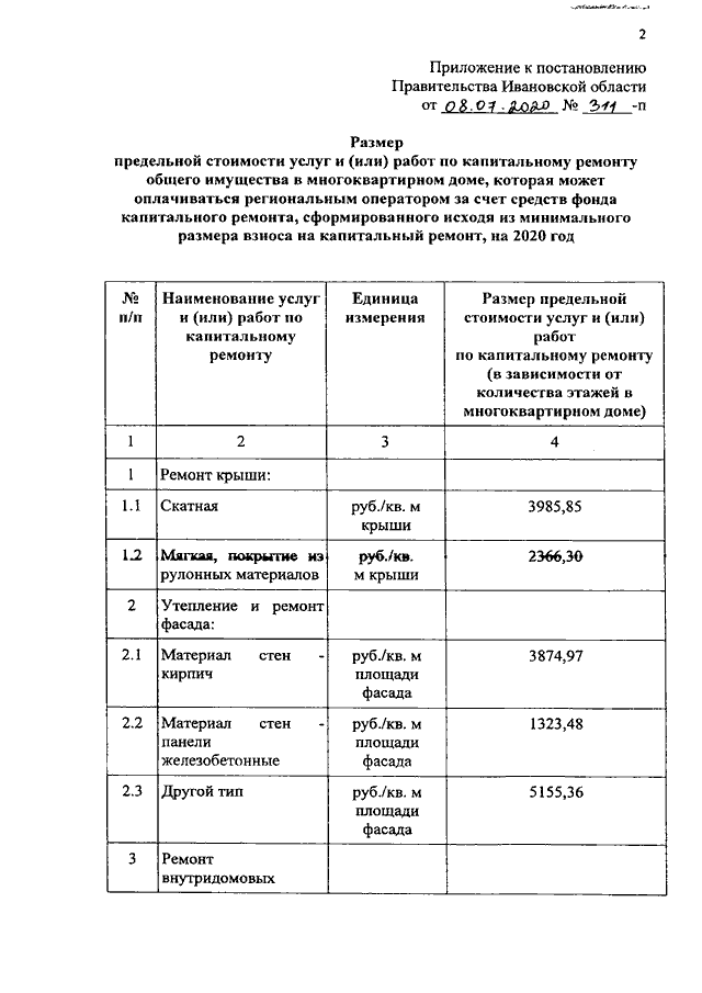 Постановление Правительства Ивановской области от 08.07.2020 N 311-п "Об установлении размера предельной стоимости услуг и (или) работ по капитальному ремонту общего имущества в многоквартирном доме, которая может оплачиваться региональным оператором за счет средств фонда капитального ремонта, сформированного исходя из минимального размера взноса на капитальный ремонт, на 2020 год"