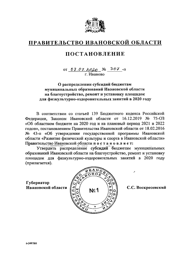 Постановление Правительства Ивановской области от 08.07.2020 N 307-п "О распределении субсидий бюджетам муниципальных образований Ивановской области на благоустройство, ремонт и установку площадок для физкультурно-оздоровительных занятий в 2020 году"