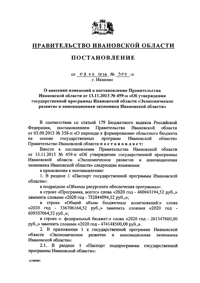 Постановление Правительства Ивановской области от 08.07.2020 N 304-п "О внесении изменений в постановление Правительства Ивановской области от 13.11.2013 N 459-п "Об утверждении государственной программы Ивановской области "Экономическое развитие и инновационная экономика Ивановской области"