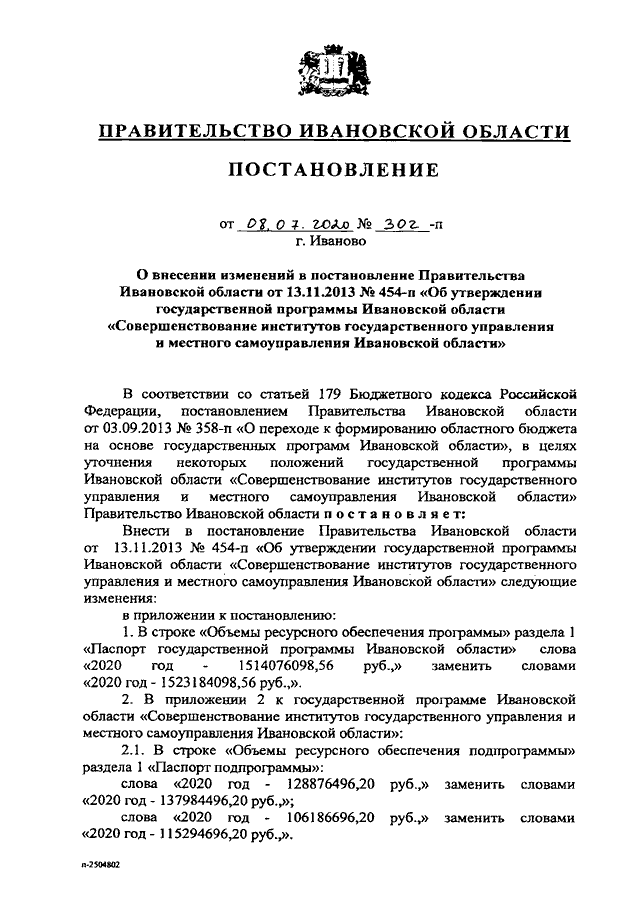 Постановление Правительства Ивановской области от 08.07.2020 N 302-п "О внесении изменений в постановление Правительства Ивановской области от 13.11.2013 N 454-п "Об утверждении государственной программы Ивановской области "Совершенствование институтов государственного управления и местного самоуправления Ивановской области"