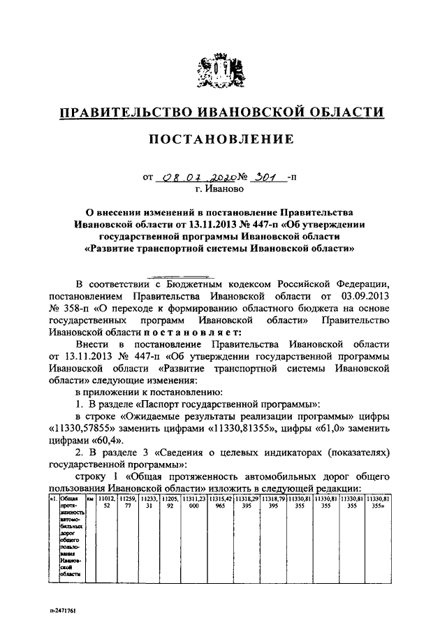 Постановление Правительства Ивановской области от 08.07.2020 N 301-п "О внесении изменений в постановление Правительства Ивановской области от 13.11.2013 N 447-п "Об утверждении государственной программы Ивановской области "Развитие транспортной системы Ивановской области"