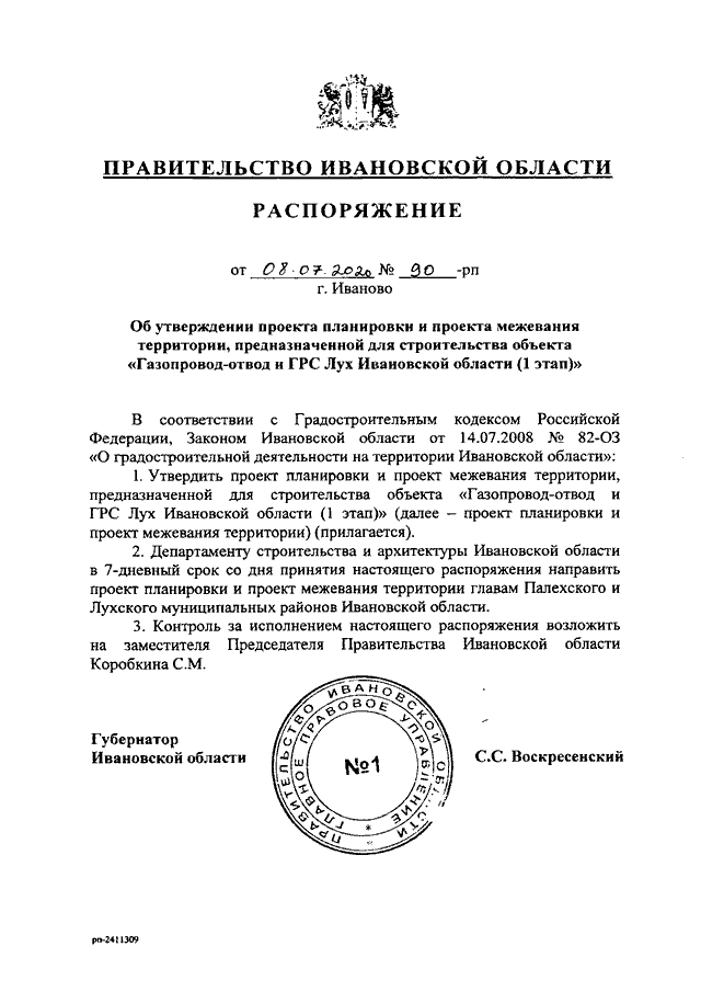 Распоряжение Правительства Ивановской области от 08.07.2020 N 90-рп "Об утверждении проекта планировки и проекта межевания территории, предназначенной для строительства объекта "Газопровод-отвод и ГРС Лух Ивановской области (1 этап)"