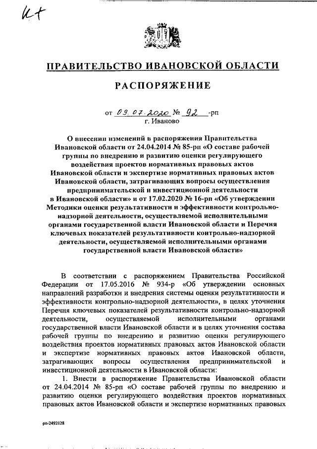 Распоряжение Правительства Ивановской области от 09.07.2020 N 92-рп "О внесении изменений в распоряжения Правительства Ивановской области от 24.04.2014 N 85-рп "О составе рабочей группы по внедрению и развитию оценки регулирующего воздействия проектов нормативных правовых актов Ивановской области и экспертизе нормативных правовых актов Ивановской области, затрагивающих вопросы осуществления предпринимательской и инвестиционной деятельности в Ивановской области" и от 17.02.2020 N 16-рп "Об утверждении Методики оценки результативности и эффективности контрольно-надзорной деятельности, осуществляемой исполнительными органами государственной власти Ивановской области, и Перечня ключевых показателей результативности контрольно-надзорной деятельности, осуществляемой исполнительными органами государственной власти Ивановской области"