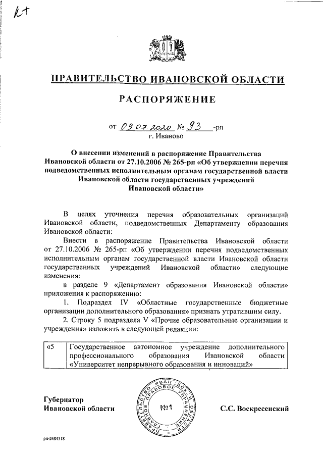 Распоряжение Правительства Ивановской области от 09.07.2020 N 93-рп "О внесении изменений в распоряжение Правительства Ивановской области от 27.10.2006 N 265-рп "Об утверждении перечня подведомственных исполнительным органам государственной власти Ивановской области государственных учреждений Ивановской области"