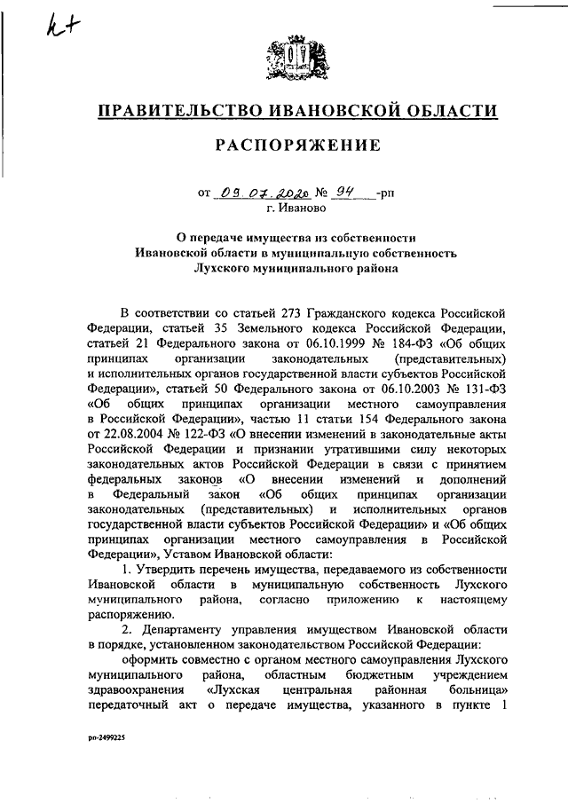 Распоряжение Правительства Ивановской области от 09.07.2020 N 94-рп "О передаче имущества из собственности Ивановской области в муниципальную собственность Лухского муниципального района"