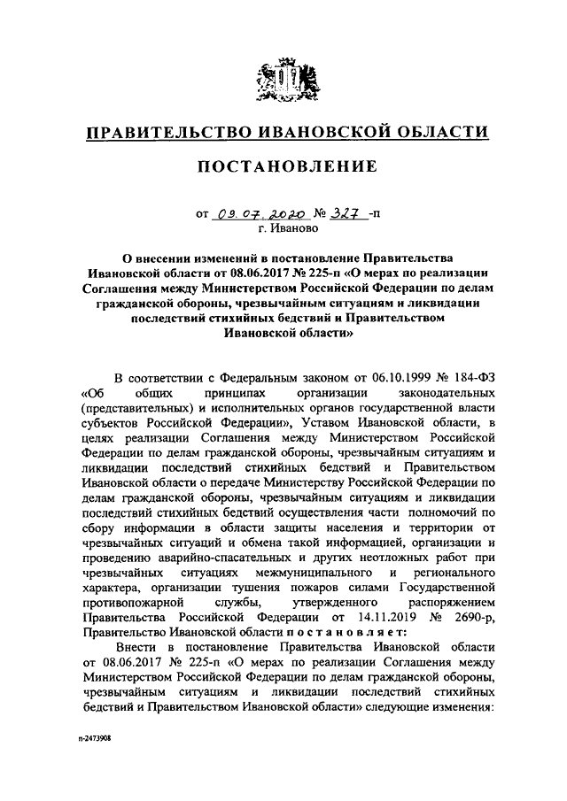 Постановление Правительства Ивановской области от 09.07.2020 N 327-п "О внесении изменений в постановление Правительства Ивановской области от 08.06.2017 N 225-п "О мерах по реализации Соглашения между Министерством Российской Федерации по делам гражданской обороны, чрезвычайным ситуациям и ликвидации последствий стихийных бедствий и Правительством Ивановской области"