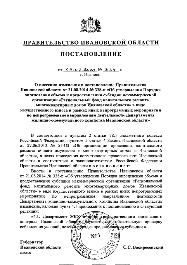 Постановление Правительства Ивановской области от 09.07.2020 N 324-п "О внесении изменения в постановление Правительства Ивановской области от 21.08.2014 N 338-п "Об утверждении Порядка определения объема и предоставления субсидии некоммерческой организации "Региональный фонд капитального ремонта многоквартирных домов Ивановской области" в виде имущественного взноса в рамках иных непрограммных мероприятий по непрограммным направлениям деятельности Департамента жилищно-коммунального хозяйства Ивановской области"