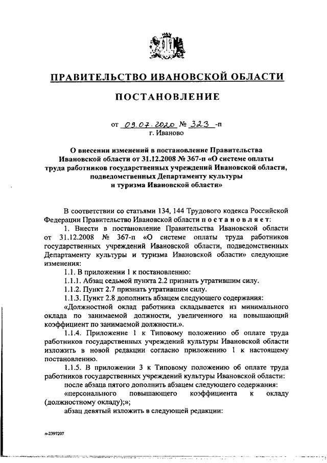 Постановление Правительства Ивановской области от 09.07.2020 N 323-п "О внесении изменений в постановление Правительства Ивановской области от 31.12.2008 N 367-п "О системе оплаты труда работников государственных учреждений Ивановской области, подведомственных Департаменту культуры и туризма Ивановской области"