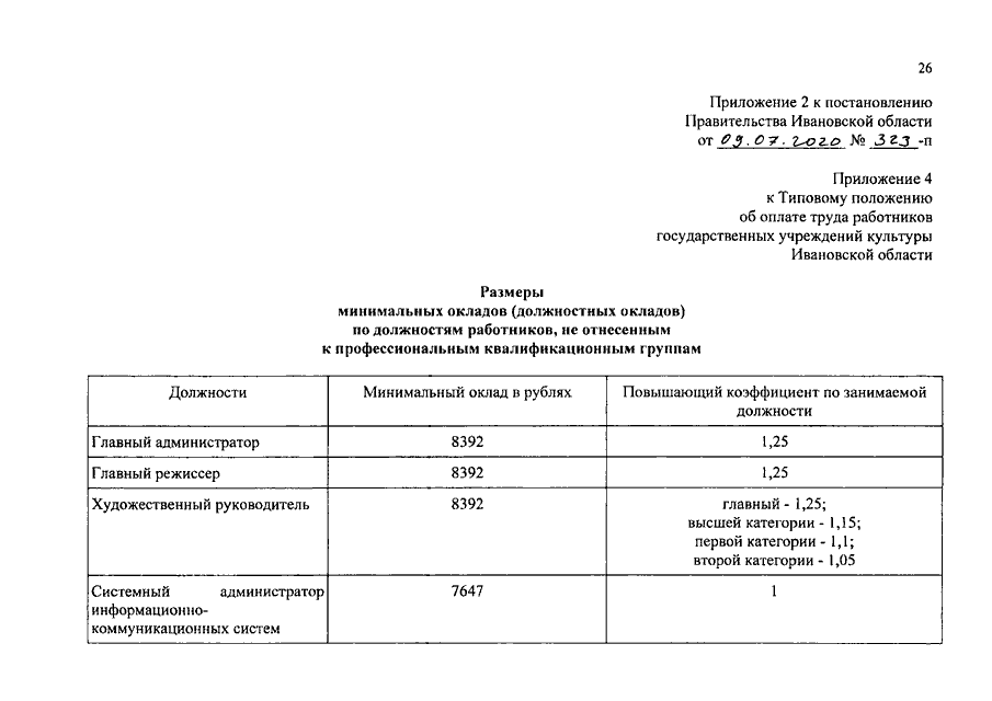 Постановление Правительства Ивановской области от 09.07.2020 N 323-п "О внесении изменений в постановление Правительства Ивановской области от 31.12.2008 N 367-п "О системе оплаты труда работников государственных учреждений Ивановской области, подведомственных Департаменту культуры и туризма Ивановской области"