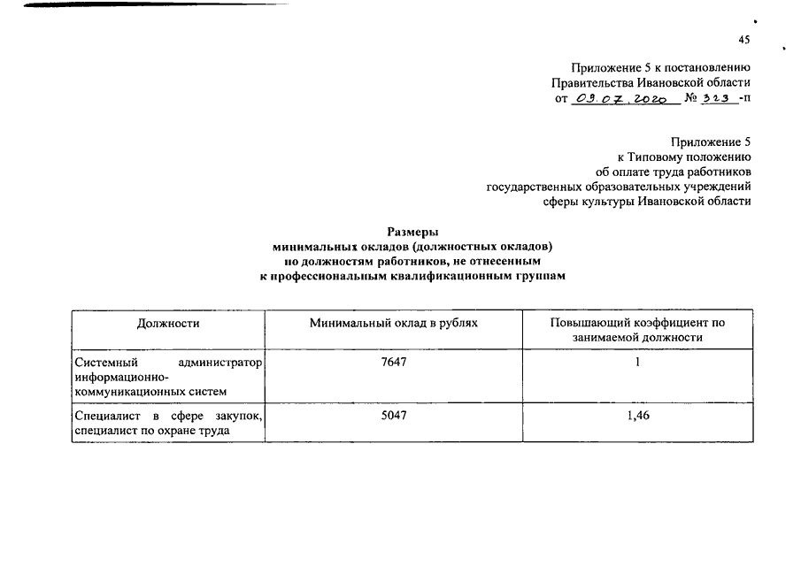 Постановление Правительства Ивановской области от 09.07.2020 N 323-п "О внесении изменений в постановление Правительства Ивановской области от 31.12.2008 N 367-п "О системе оплаты труда работников государственных учреждений Ивановской области, подведомственных Департаменту культуры и туризма Ивановской области"