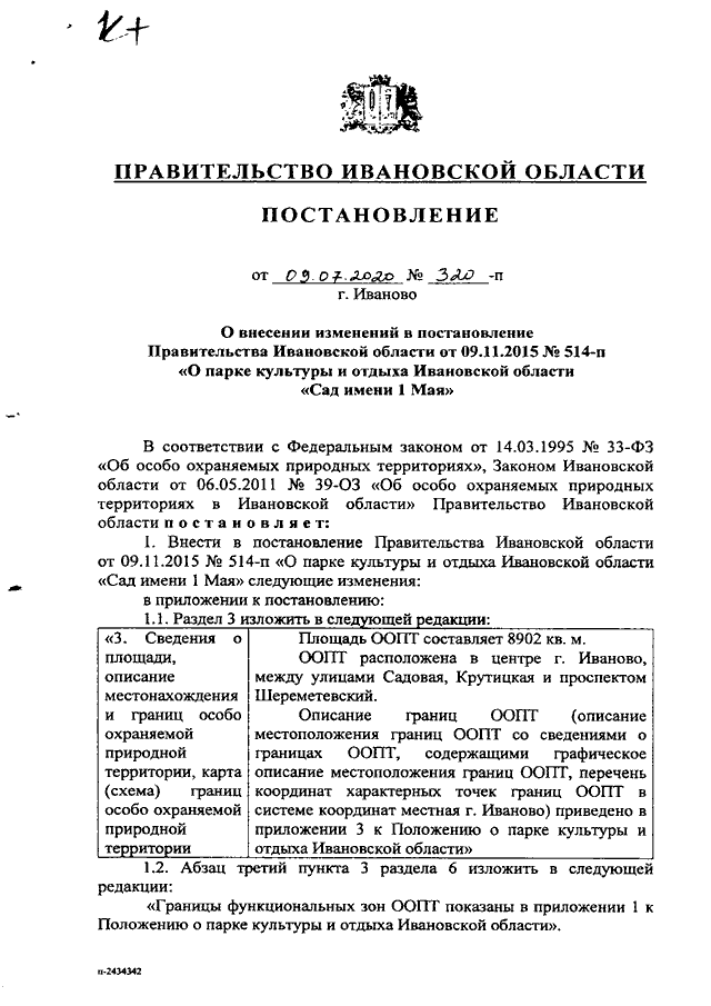 Постановление Правительства Ивановской области от 09.07.2020 N 320-п "О внесении изменений в постановление Правительства Ивановской области от 09.11.2015 N 514-п "О парке культуры и отдыха Ивановской области "Сад имени 1 Мая"