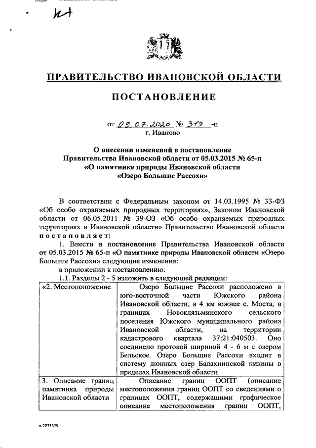 Постановление Правительства Ивановской области от 09.07.2020 N 319-п "О внесении изменений в постановление Правительства Ивановской области от 05.03.2015 N 65-п "О памятнике природы Ивановской области "Озеро Большие Рассохи"