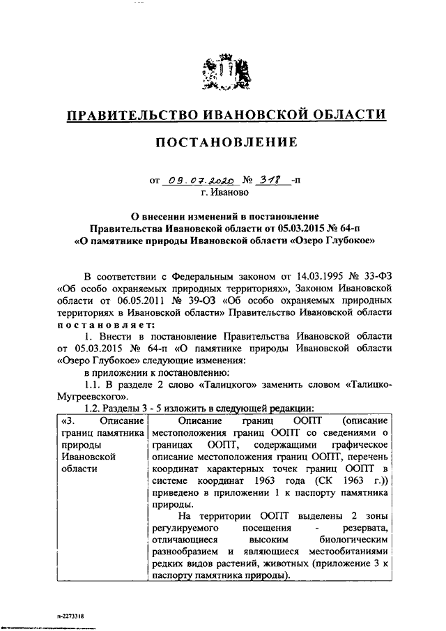 Постановление Правительства Ивановской области от 09.07.2020 N 318-п "О внесении изменений в постановление Правительства Ивановской области от 05.03.2015 N 64-п "О памятнике природы Ивановской области "Озеро Глубокое" (вместе с "Картой (схемой) границ памятника природы Ивановской области "Озеро Глубокое" с зоной регулируемого посещения - резерватом")