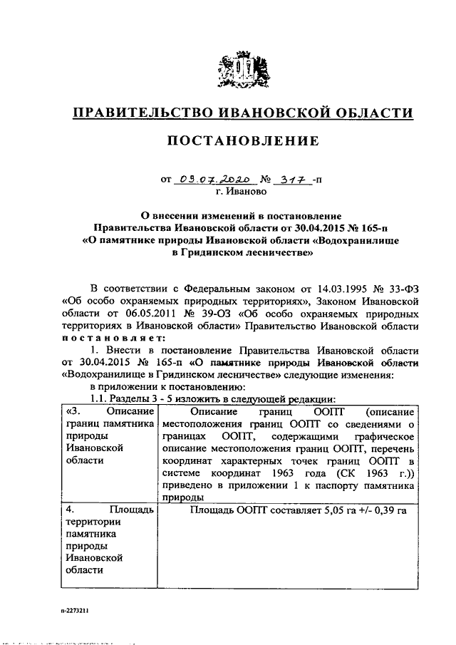 Постановление Правительства Ивановской области от 09.07.2020 N 317-п "О внесении изменений в постановление Правительства Ивановской области от 30.04.2015 N 165-п "О памятнике природы Ивановской области "Водохранилище в Гридинском лесничестве"