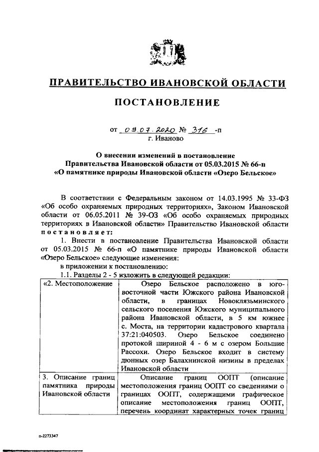 Постановление Правительства Ивановской области от 09.07.2020 N 316-п "О внесении изменений в постановление Правительства Ивановской области от 05.03.2015 N 66-п "О памятнике природы Ивановской области "Озеро Бельское"