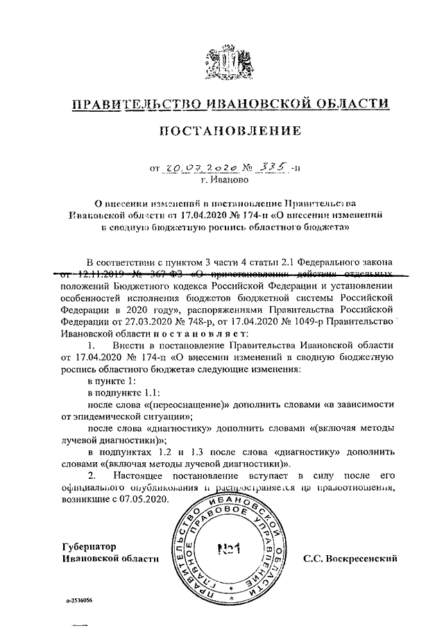 Постановление Правительства Ивановской области от 20.07.2020 N 335-п "О внесении изменений в постановление Правительства Ивановской области от 17.04.2020 N 174-п "О внесении изменений в сводную бюджетную роспись областного бюджета"