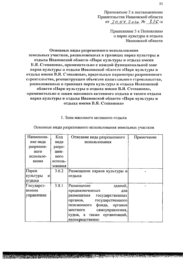 Постановление Правительства Ивановской области от 20.07.2020 N 336-п "О внесении изменений в постановление Правительства Ивановской области от 30.10.2015 N 505-п "О парке культуры и отдыха Ивановской области "Парк культуры и отдыха имени В.Я. Степанова"