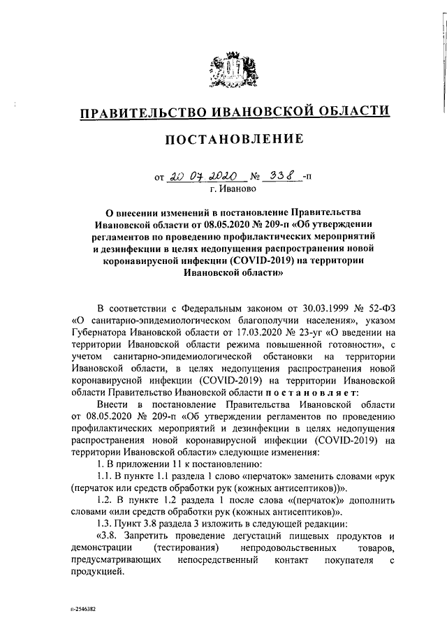 Постановление Правительства Ивановской области от 20.07.2020 N 338-п "О внесении изменений в постановление Правительства Ивановской области от 08.05.2020 N 209-п "Об утверждении регламентов по проведению профилактических мероприятий и дезинфекции в целях недопущения распространения новой коронавирусной инфекции (COVID-2019) на территории Ивановской области"