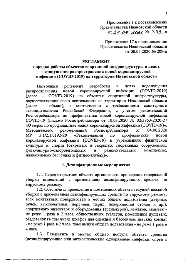 Постановление Правительства Ивановской области от 21.07.2020 N 339-п "О внесении изменений в постановление Правительства Ивановской области от 08.05.2020 N 209-п "Об утверждении регламентов по проведению профилактических мероприятий и дезинфекции в целях недопущения распространения новой коронавирусной инфекции (COVID-2019) на территории Ивановской области" (вместе с "Регламентом порядка работы объектов спортивной инфраструктуры в целях недопущения распространения новой коронавирусной инфекции (COVID-2019) на территории Ивановской области", "Регламентом порядка работы санаторно-оздоровительных детских лагерей и загородных оздоровительных лагерей в целях недопущения распространения новой коронавирусной инфекции (COVID-2019) на территории Ивановской области")