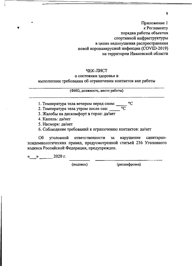 Постановление Правительства Ивановской области от 21.07.2020 N 339-п "О внесении изменений в постановление Правительства Ивановской области от 08.05.2020 N 209-п "Об утверждении регламентов по проведению профилактических мероприятий и дезинфекции в целях недопущения распространения новой коронавирусной инфекции (COVID-2019) на территории Ивановской области" (вместе с "Регламентом порядка работы объектов спортивной инфраструктуры в целях недопущения распространения новой коронавирусной инфекции (COVID-2019) на территории Ивановской области", "Регламентом порядка работы санаторно-оздоровительных детских лагерей и загородных оздоровительных лагерей в целях недопущения распространения новой коронавирусной инфекции (COVID-2019) на территории Ивановской области")