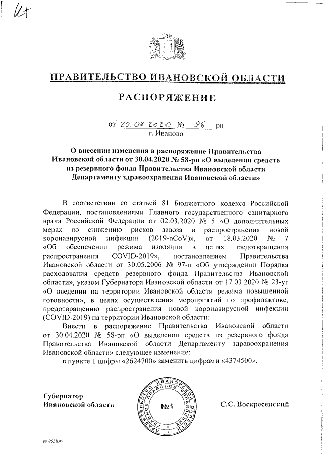 Распоряжение Правительства Ивановской области от 20.07.2020 N 96-рп "О внесении изменения в распоряжение Правительства Ивановской области от 30.04.2020 N 58-рп "О выделении средств из резервного фонда Правительства Ивановской области Департаменту здравоохранения Ивановской области"