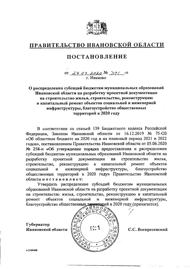Постановление Правительства Ивановской области от 27.07.2020 N 341-п "О распределении субсидий бюджетам муниципальных образований Ивановской области на разработку проектной документации на строительство жилья, строительство, реконструкцию и капитальный ремонт объектов социальной и инженерной инфраструктуры, благоустройство общественных территорий в 2020 году"