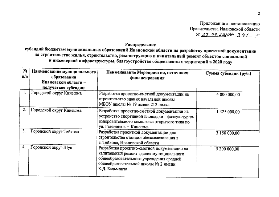 Постановление Правительства Ивановской области от 27.07.2020 N 341-п "О распределении субсидий бюджетам муниципальных образований Ивановской области на разработку проектной документации на строительство жилья, строительство, реконструкцию и капитальный ремонт объектов социальной и инженерной инфраструктуры, благоустройство общественных территорий в 2020 году"