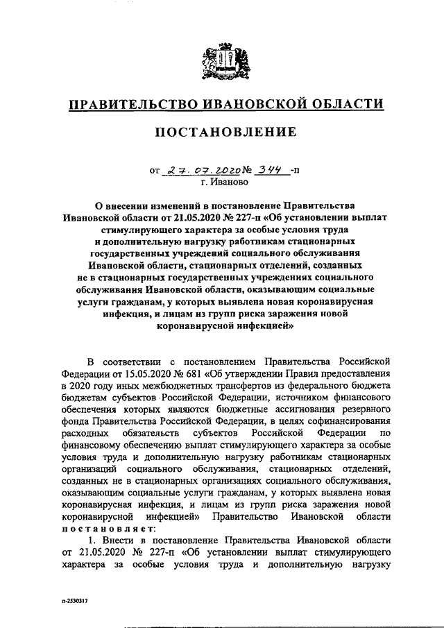 Постановление Правительства Ивановской области от 27.07.2020 N 344-п "О внесении изменений в постановление Правительства Ивановской области от 21.05.2020 N 227-п "Об установлении выплат стимулирующего характера за особые условия труда и дополнительную нагрузку работникам стационарных государственных учреждений социального обслуживания Ивановской области, стационарных отделений, созданных не в стационарных государственных учреждениях социального обслуживания Ивановской области, оказывающим социальные услуги гражданам, у которых выявлена новая коронавирусная инфекция, и лицам из групп риска заражения новой коронавирусной инфекцией"