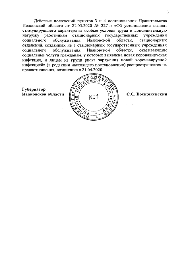 Постановление Правительства Ивановской области от 27.07.2020 N 344-п "О внесении изменений в постановление Правительства Ивановской области от 21.05.2020 N 227-п "Об установлении выплат стимулирующего характера за особые условия труда и дополнительную нагрузку работникам стационарных государственных учреждений социального обслуживания Ивановской области, стационарных отделений, созданных не в стационарных государственных учреждениях социального обслуживания Ивановской области, оказывающим социальные услуги гражданам, у которых выявлена новая коронавирусная инфекция, и лицам из групп риска заражения новой коронавирусной инфекцией"
