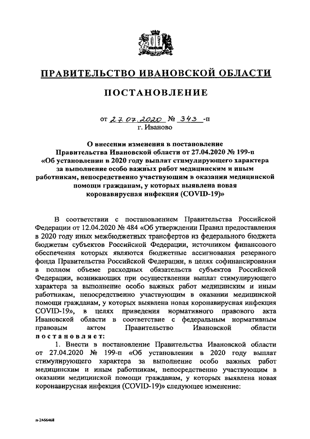 Постановление Правительства Ивановской области от 27.07.2020 N 343-п "О внесении изменения в постановление Правительства Ивановской области от 27.04.2020 N 199-п "Об установлении в 2020 году выплат стимулирующего характера за выполнение особо важных работ медицинским и иным работникам, непосредственно участвующим в оказании медицинской помощи гражданам, у которых выявлена новая коронавирусная инфекция (COVID-19)"