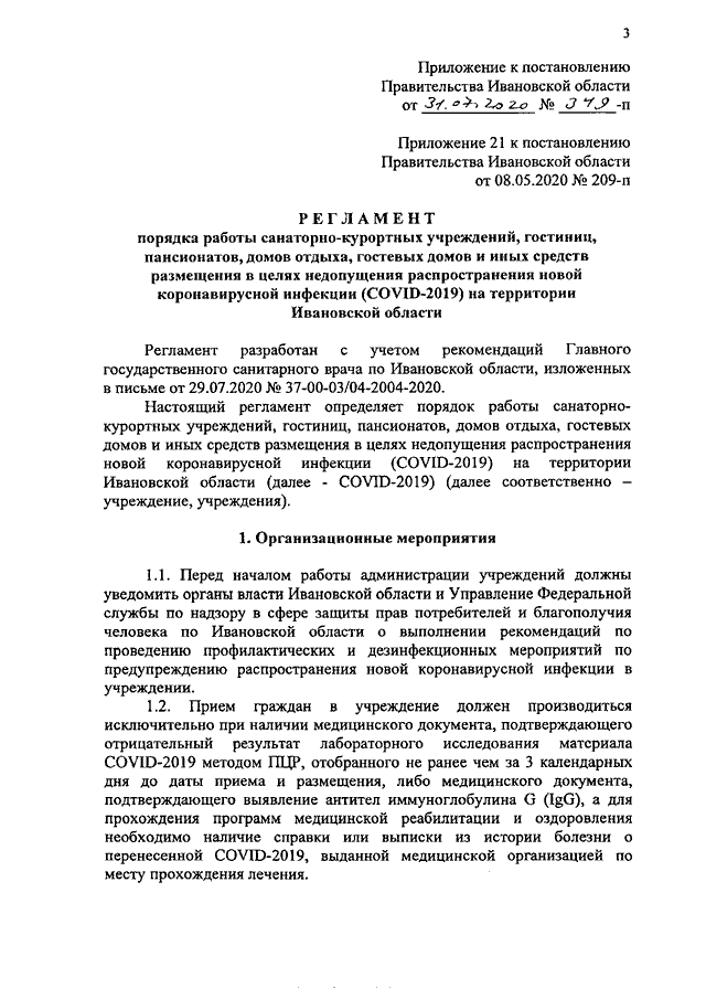 Постановление Правительства Ивановской области от 31.07.2020 N 349-п "О внесении изменений в постановление Правительства Ивановской области от 08.05.2020 N 209-п "Об утверждении регламентов по проведению профилактических мероприятий и дезинфекции в целях недопущения распространения новой коронавирусной инфекции (COVID-2019) на территории Ивановской области" (вместе с "Регламентом порядка работы санаторно-курортных учреждений, гостиниц, пансионатов, домов отдыха, гостевых домов и иных средств размещения в целях недопущения распространения новой коронавирусной инфекции (COVID-2019) на территории Ивановской области")