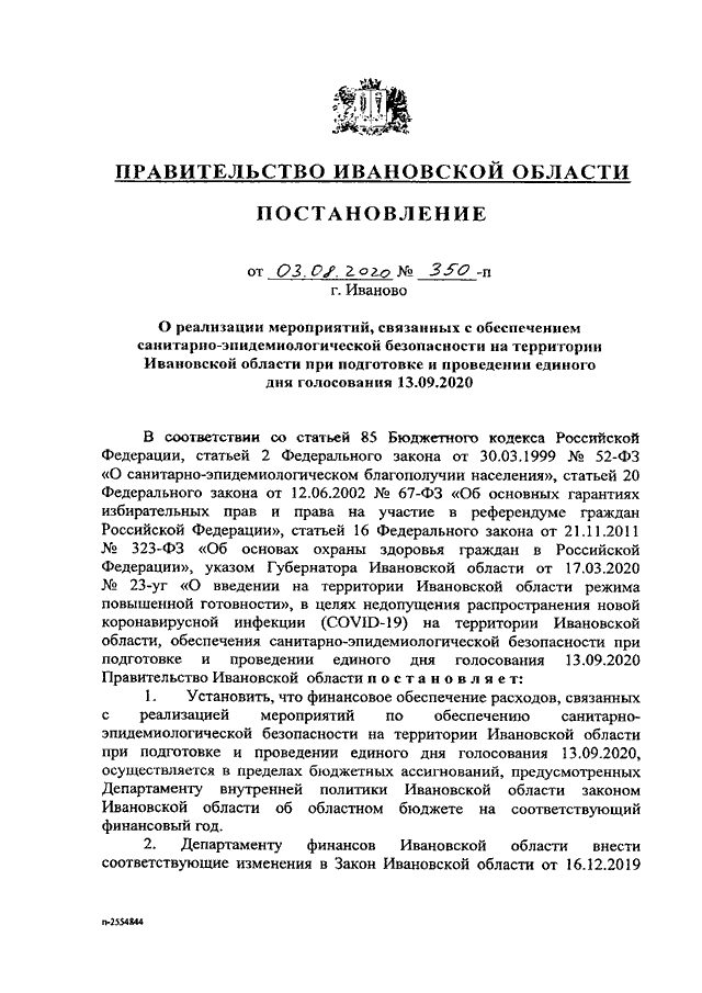 Постановление Правительства Ивановской области от 03.08.2020 N 350-п "О реализации мероприятий, связанных с обеспечением санитарно-эпидемиологической безопасности на территории Ивановской области при подготовке и проведении единого дня голосования 13.09.2020"