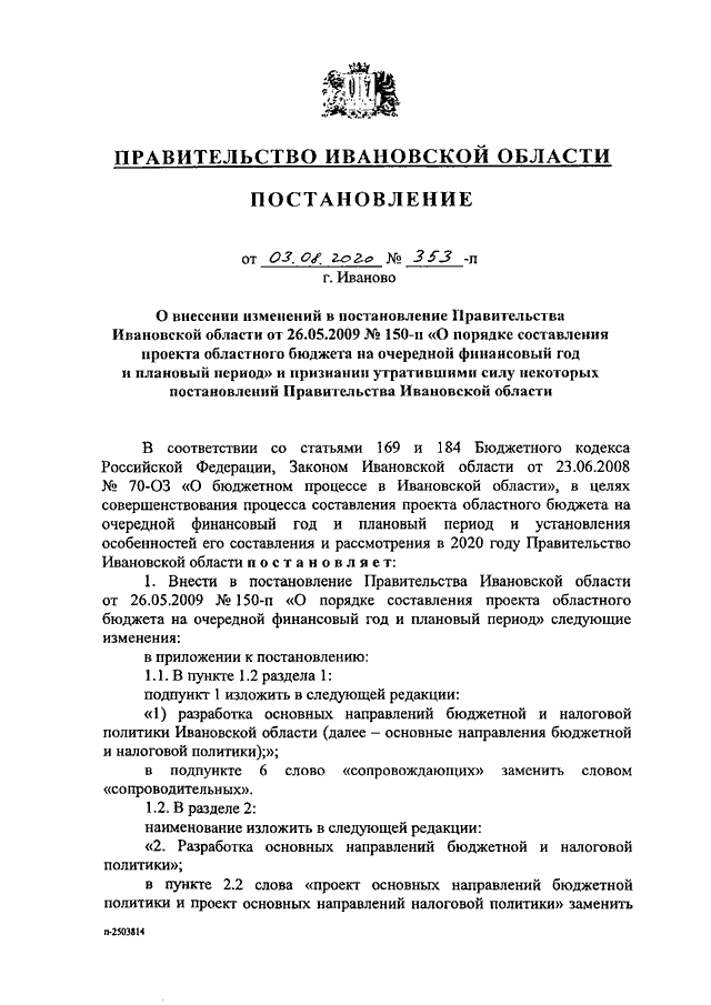 Постановление Правительства Ивановской области от 03.08.2020 N 353-п "О внесении изменений в постановление Правительства Ивановской области от 26.05.2009 N 150-п "О порядке составления проекта областного бюджета на очередной финансовый год и плановый период" и признании утратившими силу некоторых постановлений Правительства Ивановской области"
