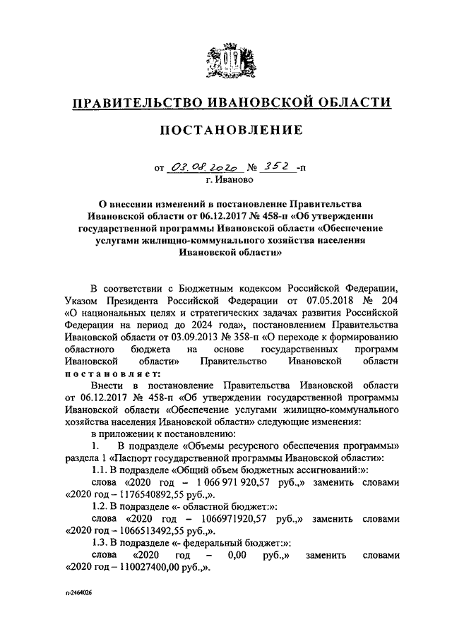 Постановление Правительства Ивановской области от 03.08.2020 N 352-п "О внесении изменений в постановление Правительства Ивановской области от 06.12.2017 N 458-п "Об утверждении государственной программы Ивановской области "Обеспечение услугами жилищно-коммунального хозяйства населения Ивановской области"