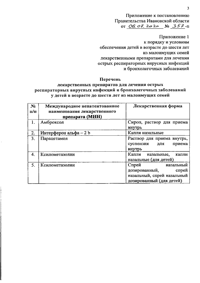 Постановление Правительства Ивановской области от 06.08.2020 N 357-п "О внесении изменений в постановление Правительства Ивановской области от 04.12.2019 N 471-п "Об утверждении порядка и условий обеспечения детей в возрасте до шести лет из малоимущих семей лекарственными препаратами для лечения острых респираторных вирусных инфекций и бронхолегочных заболеваний и о внесении изменений в постановления Правительства Ивановской области от 27.06.2008 N 170-п "Об утверждении Перечня государственных услуг (работ), предоставляемых (выполняемых) исполнительными органами государственной власти Ивановской области и подведомственными им учреждениями", от 17.01.2013 N 6-п "Об утверждении перечня государственных услуг, предоставление которых организуется в многофункциональных центрах предоставления государственных (муниципальных) услуг исполнительными органами государственной власти Ивановской области" (вместе с "Перечнем лекарственных препаратов для лечения острых респираторных вирусных инфекций и бронхолегочных заболеваний у детей в возрасте до шести лет из малоимущих семей")