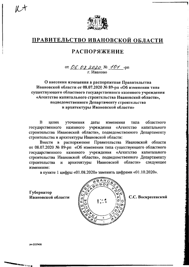 Распоряжение Правительства Ивановской области от 06.08.2020 N 101-рп "О внесении изменения в распоряжение Правительства Ивановской области от 08.07.2020 N 89-рп "Об изменении типа существующего областного государственного казенного учреждения "Агентство капитального строительства Ивановской области", подведомственного Департаменту строительства и архитектуры Ивановской области"