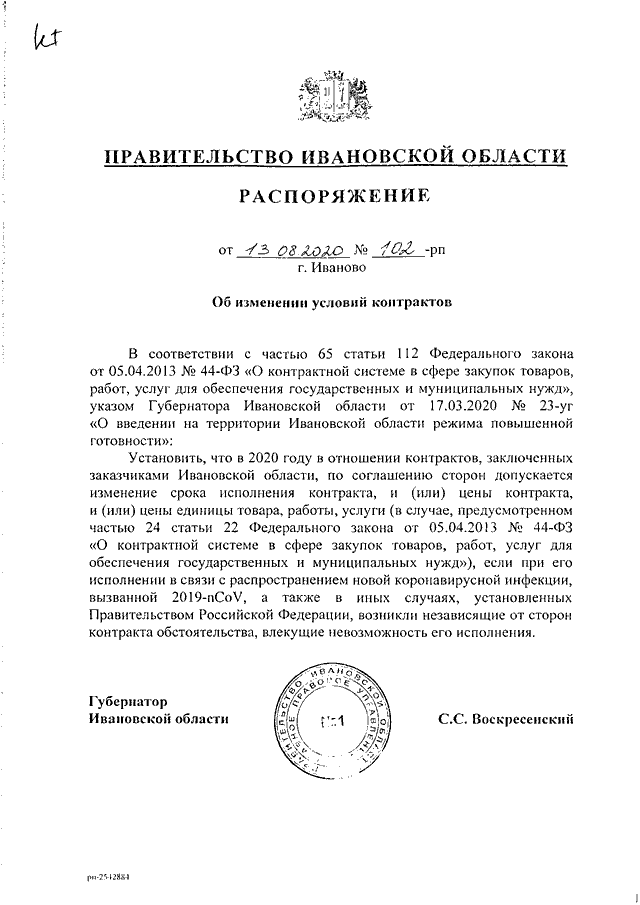 Распоряжение Правительства Ивановской области от 13.08.2020 N 102-рп "Об изменении условий контрактов"