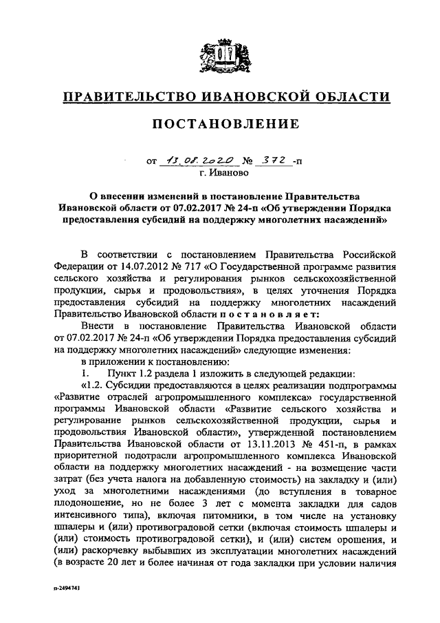 Постановление Правительства Ивановской области от 13.08.2020 N 372-п "О внесении изменений в постановление Правительства Ивановской области от 07.02.2017 N 24-п "Об утверждении Порядка предоставления субсидий на поддержку многолетних насаждений"