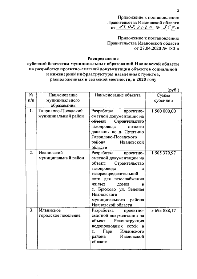 Постановление Правительства Ивановской области от 13.08.2020 N 367-п "О внесении изменения в постановление Правительства Ивановской области от 27.04.2020 N 180-п "О распределении субсидий бюджетам муниципальных образований Ивановской области на разработку проектно-сметной документации объектов социальной и инженерной инфраструктуры населенных пунктов, расположенных в сельской местности, в 2020 году"