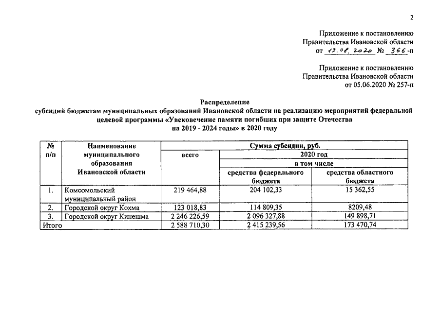 Постановление Правительства Ивановской области от 13.08.2020 N 366-п "О внесении изменения в постановление Правительства Ивановской области от 05.06.2020 N 257-п "О распределении субсидий бюджетам муниципальных образований Ивановской области на реализацию мероприятий федеральной целевой программы "Увековечение памяти погибших при защите Отечества на 2019 - 2024 годы" в 2020 году"