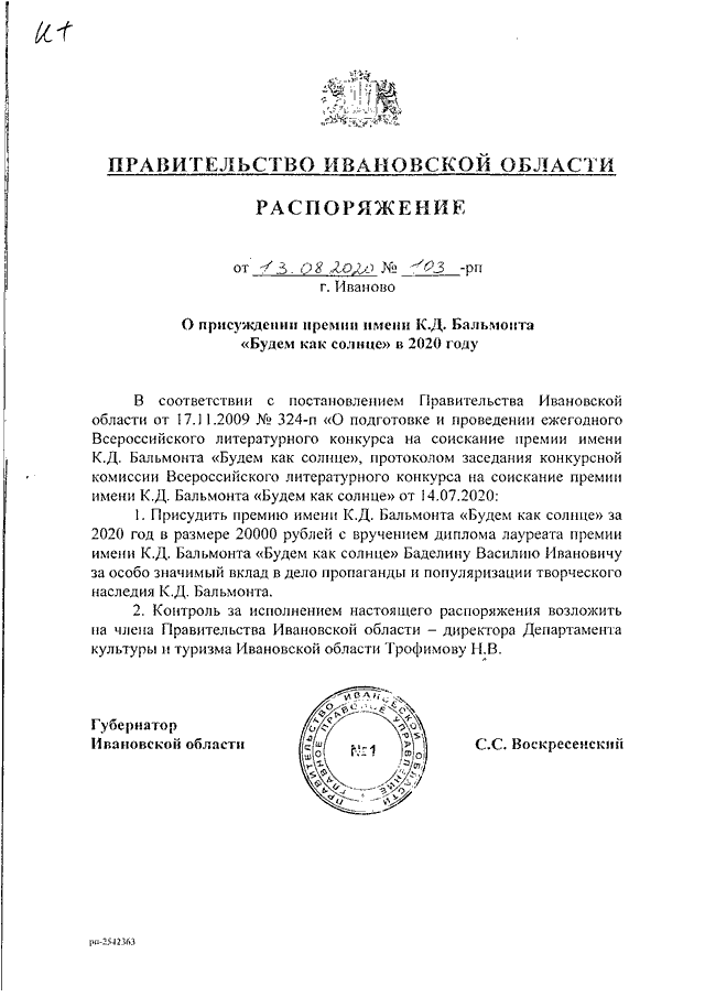 Распоряжение Правительства Ивановской области от 13.08.2020 N 103-рп "О присуждении премии имени К.Д. Бальмонта "Будем как солнце" в 2020 году"