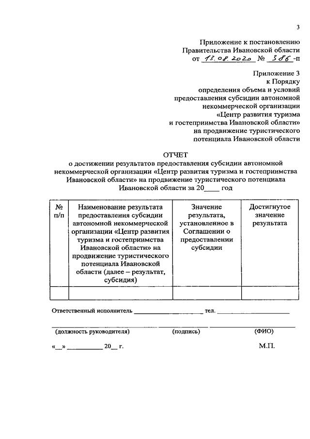 Постановление Правительства Ивановской области от 13.08.2020 N 386-п "О внесении изменений в постановление Правительства Ивановской области от 21.10.2019 N 413-п "Об утверждении Порядка определения объема и условий предоставления субсидии автономной некоммерческой организации "Центр развития туризма и гостеприимства Ивановской области" на продвижение туристического потенциала Ивановской области"